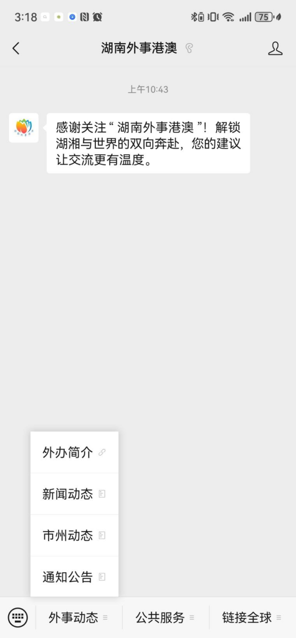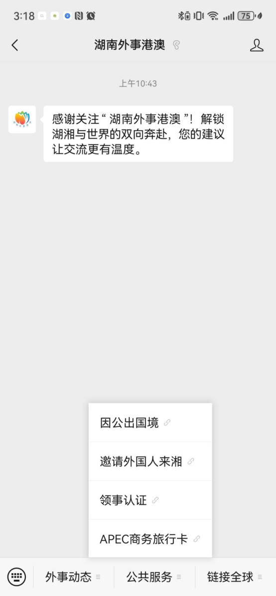 公众号设置“外事动态”“公共服务”“链接全球”三个板块。