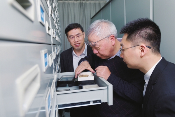 1月22日,在中国科学院南京地质古生物研究所标本馆,中国科学院院士、研究员朱茂炎(中),研究员赵方臣(左),副研究员曾晗(右)查看化石。