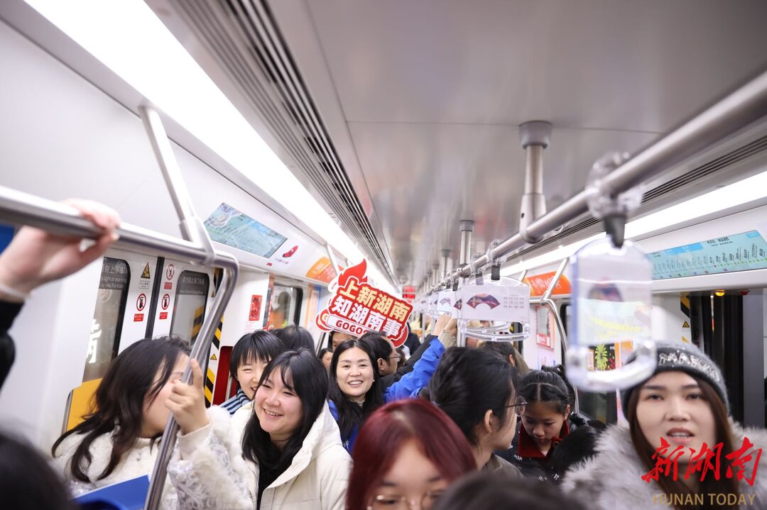 华声在线1月31日讯(全媒体记者 刘颖 胡怡 摄影 赵持 田超)今天上午,长沙地铁2号线的车厢被欢声笑语填满,由新湖南客户端联合湖南亚文传媒打造的新湖南“许一个愿望,给未来5年”地铁列车满载市民心愿出发!省人大代表李召霞、余国才,省政协委员苏孝群,以及湘超永州队球员高响化身“心愿使者”,向乘客派送新春福袋,共赴一场与未来的温暖约定。