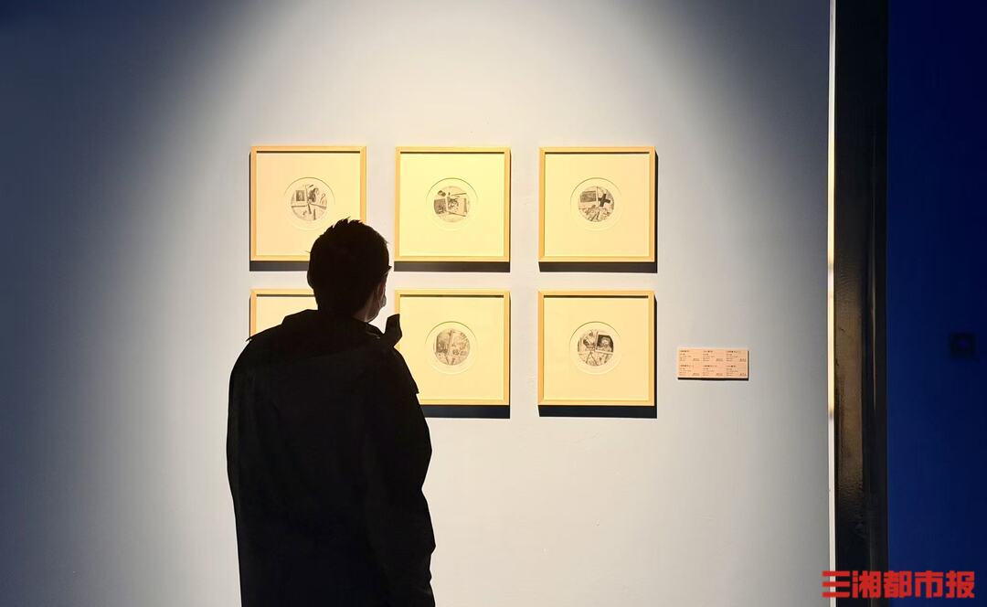 “这表达了什么?为什么要这样画?”正在观展的大学生张梓欣边观展边抛出问题,不多时手机里传来回答:“艺术家通过藏书票这种微型艺术形式,将小说中流动的意识、都柏林的市井图景浓缩进画面。周旖旎的《Ulysses》以强烈的黑白对比和几何化造型,呈现现代主义文学的先锋精神……”