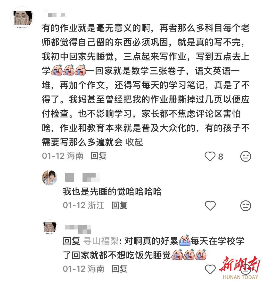 在相关视频评论区,一条“孩子写作业到11点,不如不写,睡眠更重要”的留言获赞过万,道出不少家长心声。