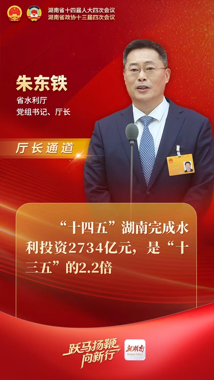 “‘十四五’以来,全省水利系统强力推进‘四纵三横、一圈两带’湖南现代化水网建设,完成水利投资2734亿元,是‘十三五’的2.2倍,为保安全、促发展、惠民生作出积极贡献。”2月3日上午,在省十四届人大四次会议第一场“厅长通道”上,省水利厅党组书记、厅长朱东铁说道。
