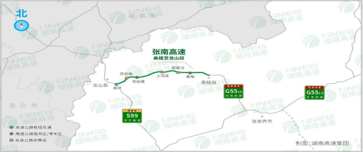 G5515张南高速桑龙段(东西走向):茅坪互通至桑植西枢纽段已通车,全线设置有陈家河、上河溪、茨岩塘3个收费站,茅坪1个枢纽互通,桑植、茨岩塘2处服务区,按双向四车道高速公路标准设计,设计速度100公里/小时,运营速度110公里/小时。