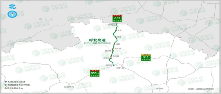 G59呼北高速炉慈段(南北走向):炉红山隧道至慈利西枢纽互通段已通车,全线设置有太平、维新、龙王洞、东岳观4个收费站,慈利西1枢纽互通,老峪、东岳观2处服务区,国太桥1处停车区,按双向四车道高速公路标准设计,设计速度100公里/小时,运营速度110公里/小时。