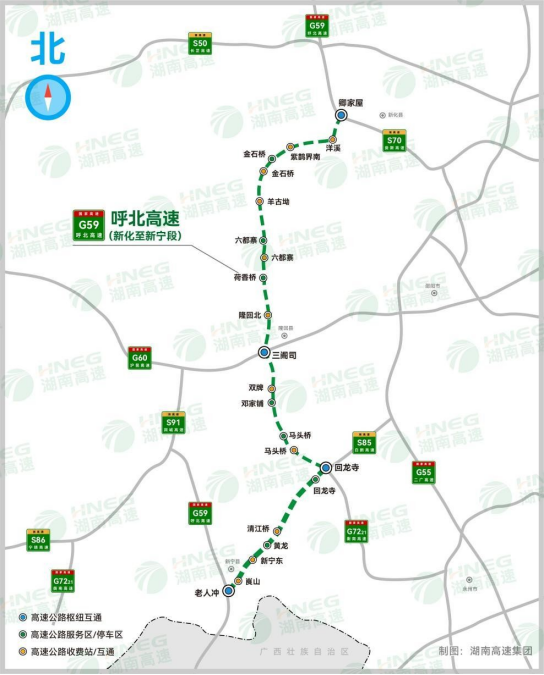 G59呼北高速新化至新宁段(南北走向):卿家屋枢纽互通至老人冲枢纽互通段已通车,全线设有洋溪、紫鹊界南、金石桥、羊古坳、六都寨、隆回北、双牌、马头桥、清江桥、新宁东、崀山等11处收费站,金石桥、荷香桥、邓家铺、回龙寺4处服务区,六都寨、马头桥、黄龙3处停车区,按双向四车道高速公路标准设计,其中K0至K32+100采用单一限速100公里/小时,其余路段则采用分车型限速,客车120公里/小时,其他车型100公里/小时。
