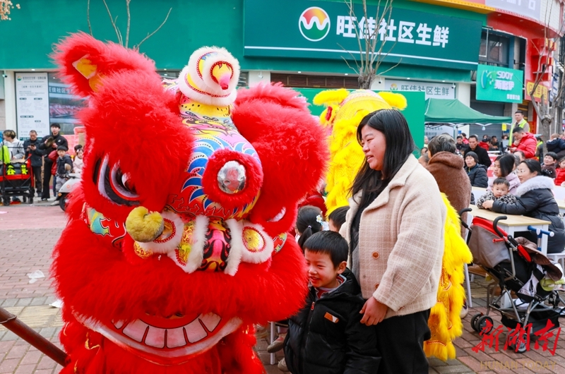 2月3日,新田县龙泉街道双碧街,精彩的舞狮表演吸引了众多市民驻足观赏。连日来,当地通过举办舞狮、舞龙等传统民俗活动,营造喜庆氛围,迎接新春佳节到来。刘贵雄 摄(湖南图片库)