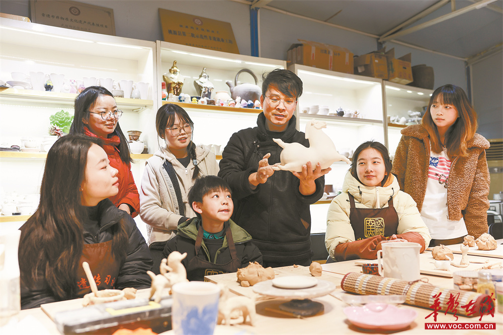 2月3日,常德市武陵窑非遗工坊,市级非物质文化遗产代表性项目武陵陶瓷烧制技艺代表性传承人张迪熙(右三)在指导游客制作陶马,一件件寓意吉祥的陶马作品在巧手中“跃出”,展现传统工艺魅力,传递浓浓新春气息。