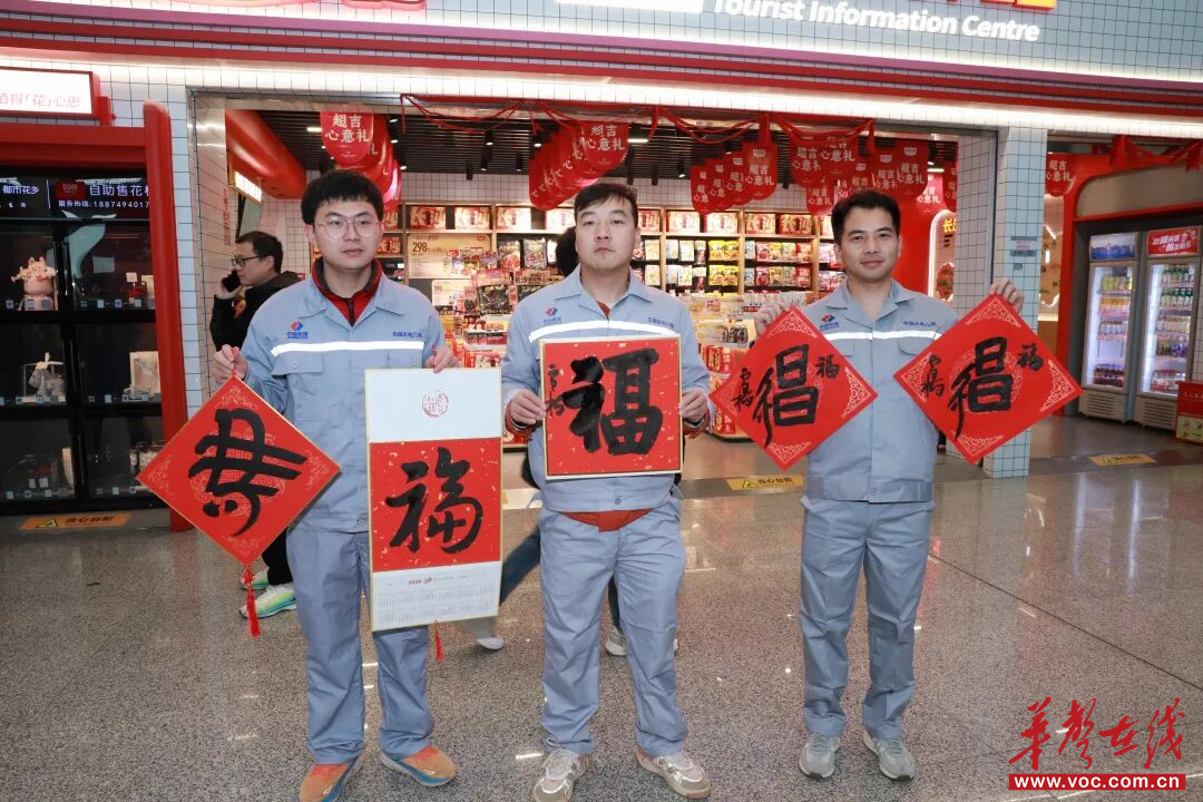 南来北往的旅客纷纷被吸引驻足欣赏。“中国春节,福气满满,很好!”正在候机的俄罗斯友人伊利亚接过书法家书写的“福”字卷轴,仔细端详,他表示要将这个“福”字带回莫斯科,与家人分享中国新年的吉祥寓意。