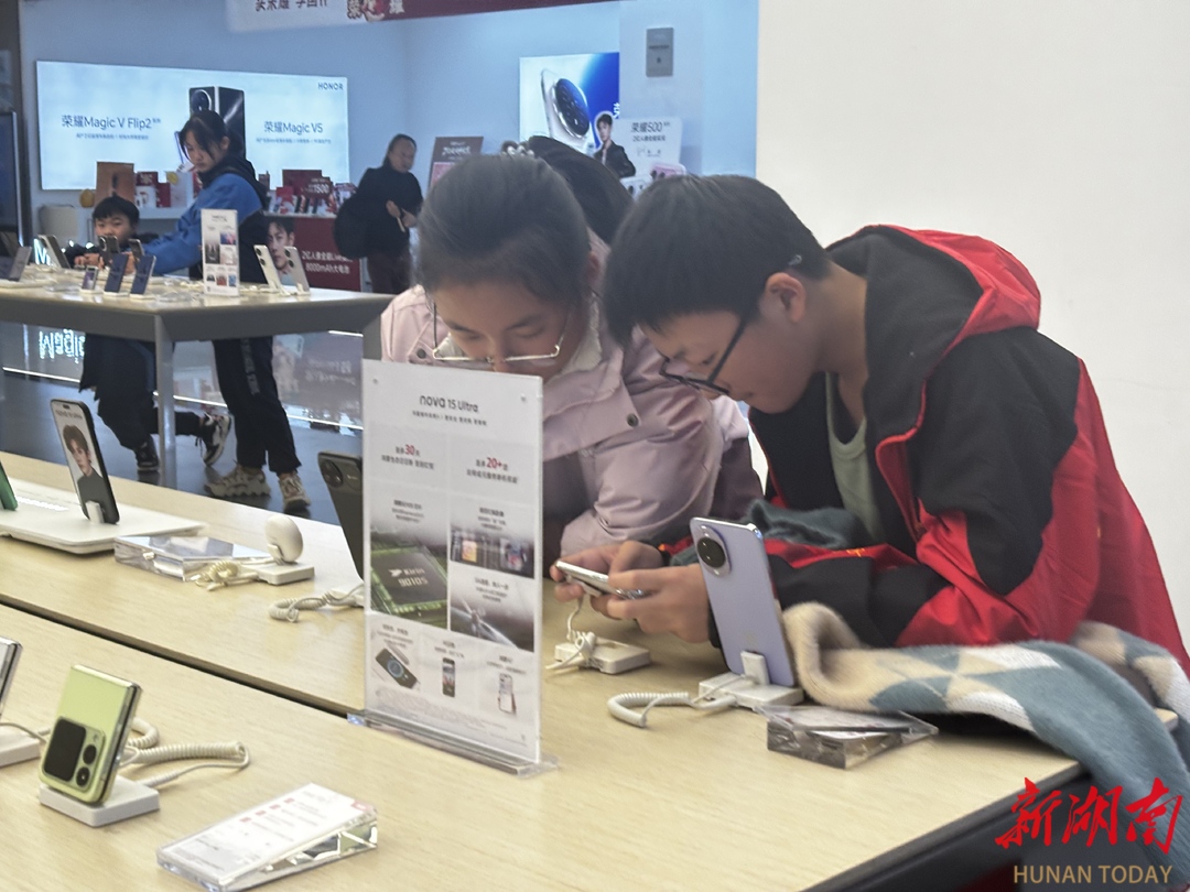 寒假一到,长沙各大商圈的手机专卖店里便迎来一群“小熟客”。在各品牌手机的展示台前,孩子们或站或坐,凑在一起,手指在样机屏幕上快速滑动、点击。这片本该用于产品体验的空间,俨然成了不少孩子假期的新聚集地。