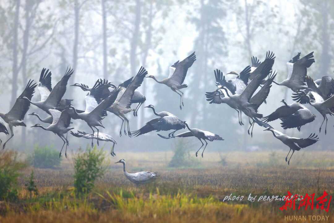 彭祥林在洞庭湖拍摄到的国家二级保护动物灰鹤。受访者供图