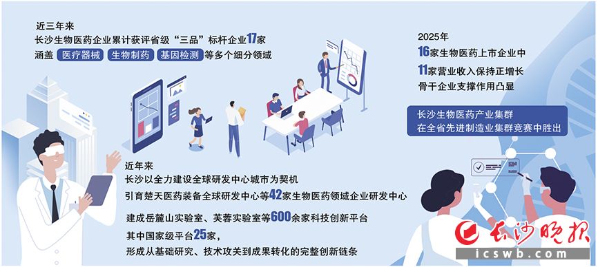 2025年,长沙生物医药产业展现出强劲的韧性,交出了一份扎实的“成绩单”。数据显示,近三年来,长沙生物医药企业累计获评省级“三品”标杆企业17家,涵盖医疗器械、生物制药、基因检测等多个细分领域。这些标杆企业不仅在技术创新、市场拓展方面表现突出,更在产业链协同、产业集群建设方面发挥了重要的引领作用。