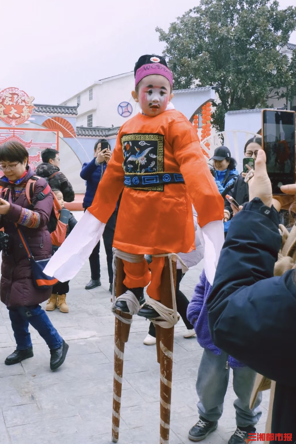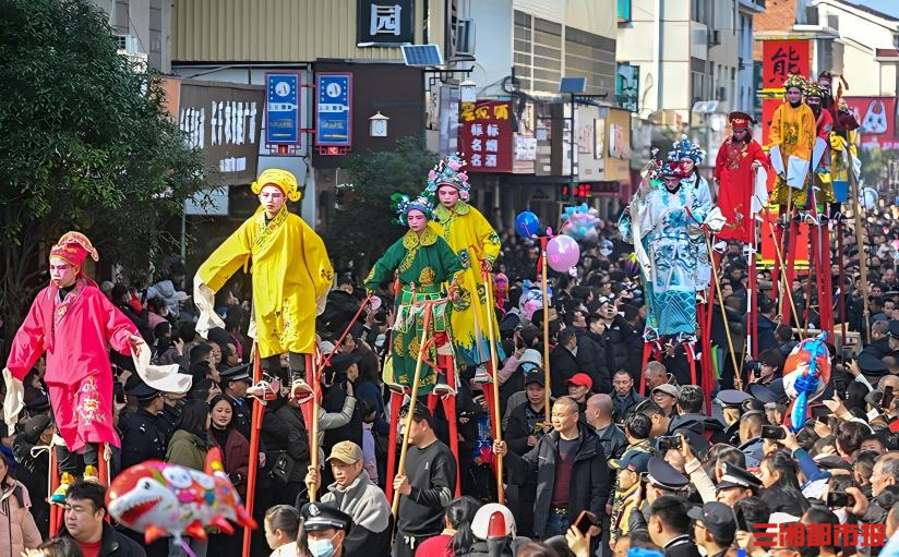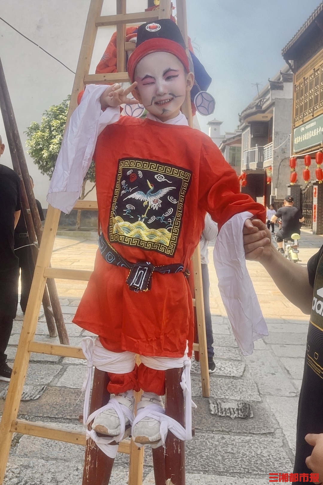 上午10时,岳阳市汨罗市长乐镇人流如织。古镇的青石板路上,一个小小的身影格外引人注目:梳着利落的发髻,身着绣着祥云纹样的红色官服,腰间系着黑色玉带,脚下踩着1米多高的木质高跷,迈着灵动俏皮的步子穿梭在人群中。