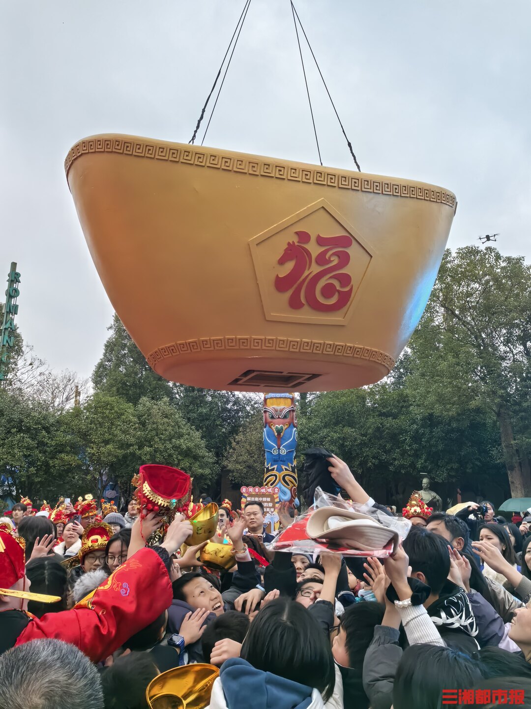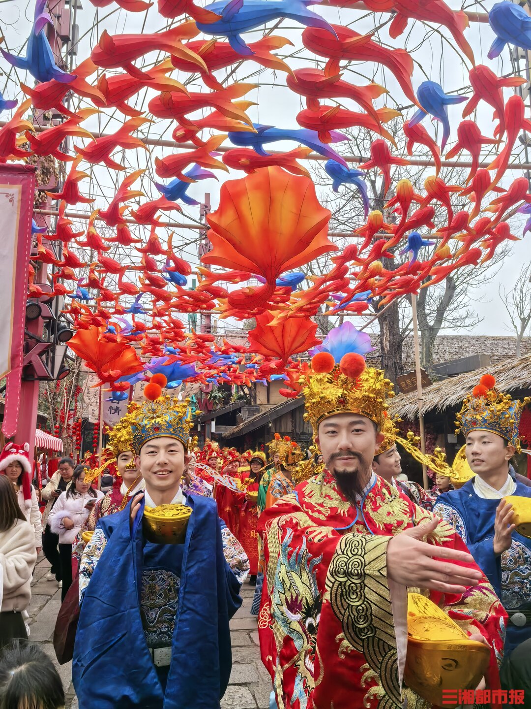 开城仪式上,百名“财神”列阵赐福,瞬间点燃游客热情。“这场面太震撼了,手机都拍不过来!好运气从这里开始!” 一位长沙游客兴奋地说道。仪式结束后,“财神”悄然散入古城各处,与游客惊喜相遇,开启“财神平行宇宙”的沉浸体验。接过财神祝福,新春狂欢在“湘服灶王争霸”中升腾起十足烟火气。