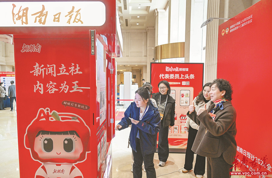 2月1日,出席省两会的代表委员在湖南日报拍报机前争相打卡。