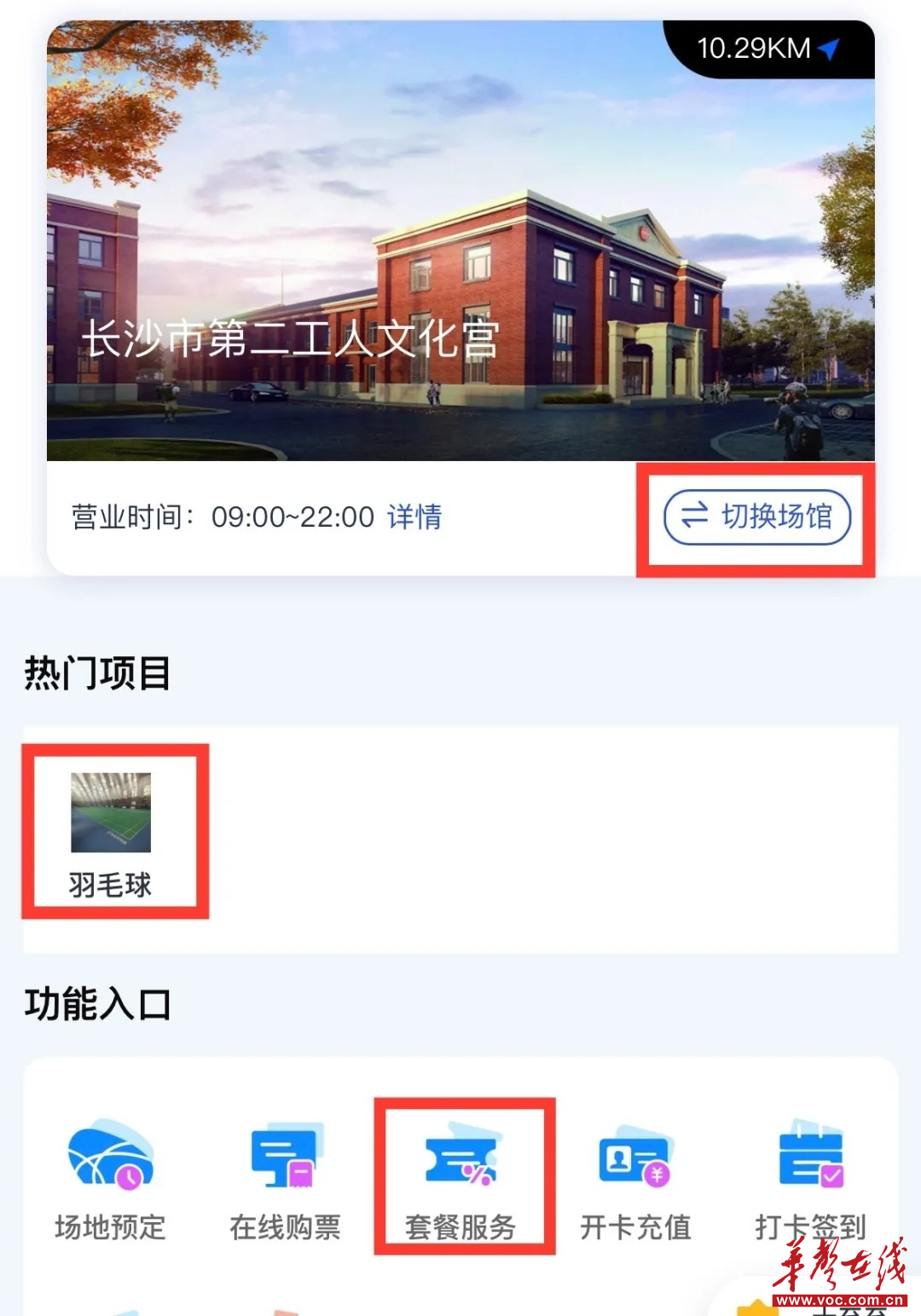 在“百宫联盟”微信小程序中,点击【切换场馆】可选择相应的工人文化宫;点击【热门项目】可预约不同场馆。长沙市第二工人文化宫的健身房公益体验次卡需点击【套餐服务】进行预约。