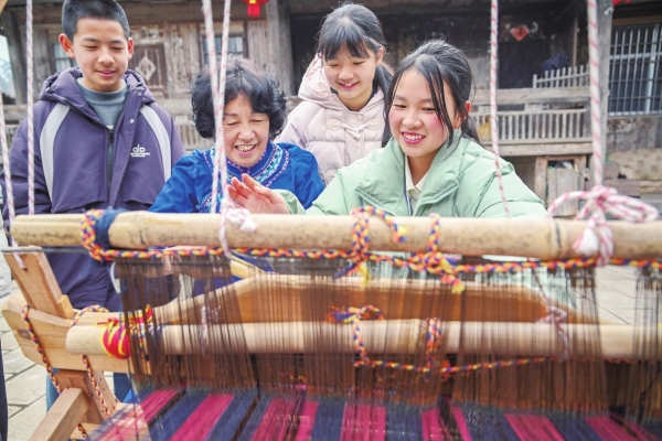 学生在马头溪村体验土家织锦技艺。