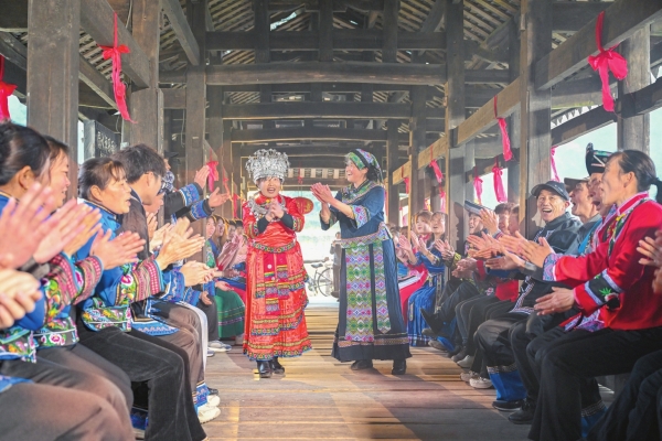 马头溪村村民在风雨桥上教学生唱土家山歌。