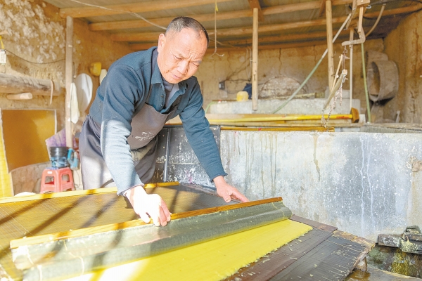 春节前夕,浏阳手工竹纸制作技艺非遗代表性传承人黄隆信在道官冲制作手工竹纸。