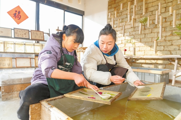 春节前夕,道官冲村民张兆媛(右)和女儿一起制作花草纸。本版照片均为华声在线全媒体记者 傅聪 易昂 邹尚奇 摄