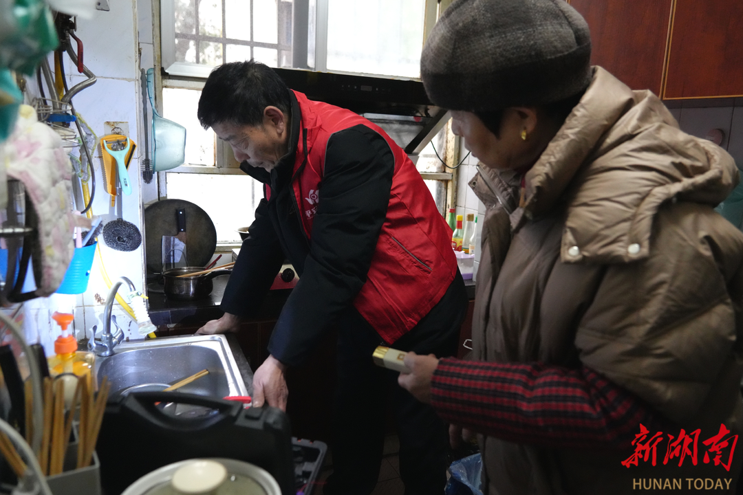 “万娭毑,配件我买回来了。”2月12日上午,长沙市雨花区侯家塘街道广济桥社区里,“跑腿团”志愿者敲开独居老人万娭毑家大门,带着新买的维修配件直奔厨房,维修师傅连建湘早已带着工具箱等在水槽旁。