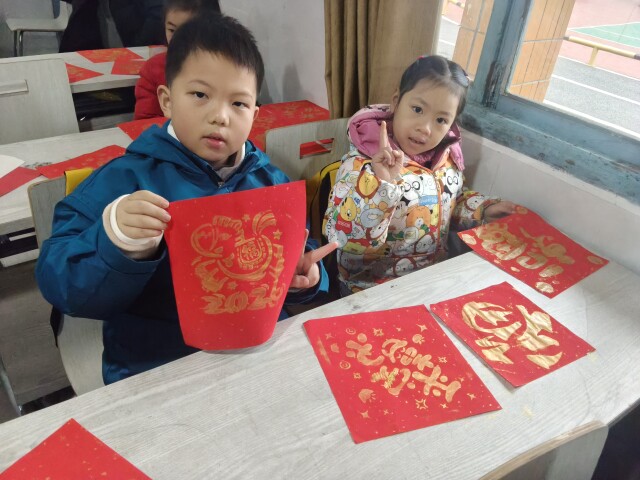 2月6日,花垣县爱心托管班里,大学生志愿者龙思唯带着孩子们上非遗拓印课。她备好传统“福”字纹样,孩子们却玩出了新花样:有人把“年年有余”的鱼身涂金、鱼尾勾黑,像跃出水面的锦鲤;有人在同一个模板上交替抹出渐变,说是“新年的阳光洒在福字上”。