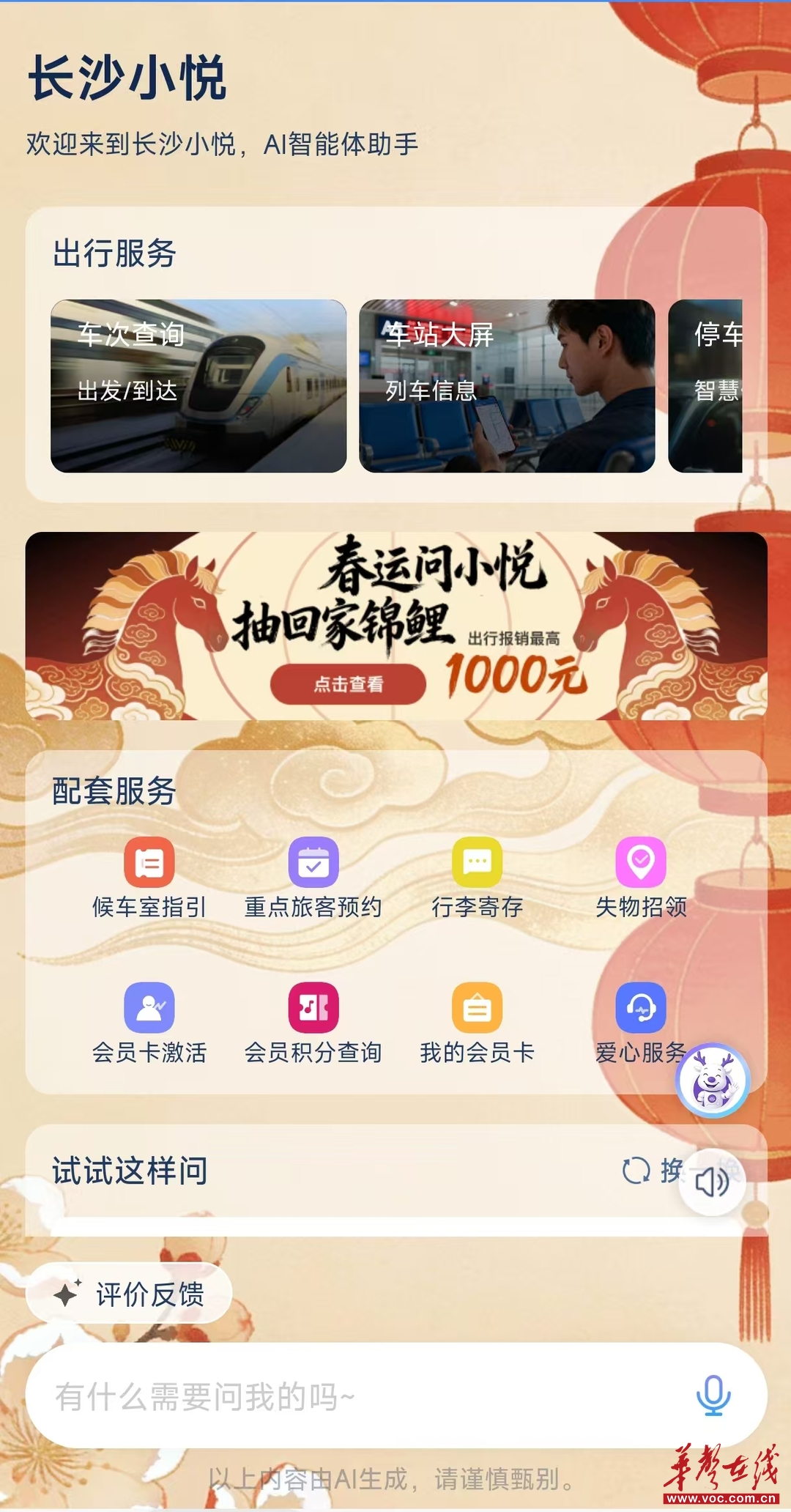 针对春运客流高峰、旅客咨询量大幅增加的实际情况,长沙车站试点推出“小悦U彩”AI出行智能体助手,为旅客出行提供智慧化解决方案。据了解,“小悦U彩”是国铁广州局继广州白云站之后,在湖南地区落地的首批AI出行智能体,服务覆盖旅客从进站到抵达的全流程需求。