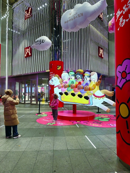 2月13日,记者刚来到五一广场的王府井百货就被年味撞个满怀,商场门前悬挂着充气白马,马背上载着憨态可掬的卡通福神,空中悬吊的云朵气模印着“五路好运马上驾到”的字样,往来路人纷纷放慢脚步拍照。