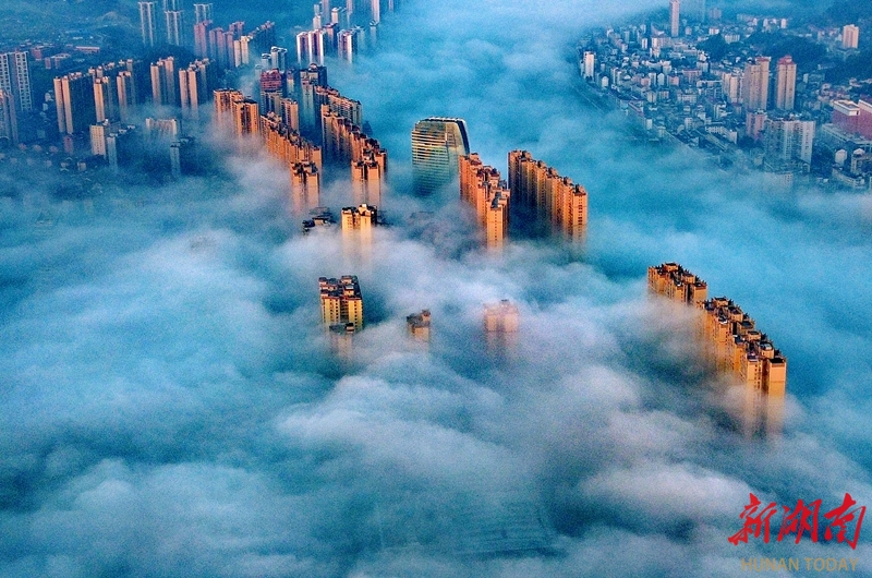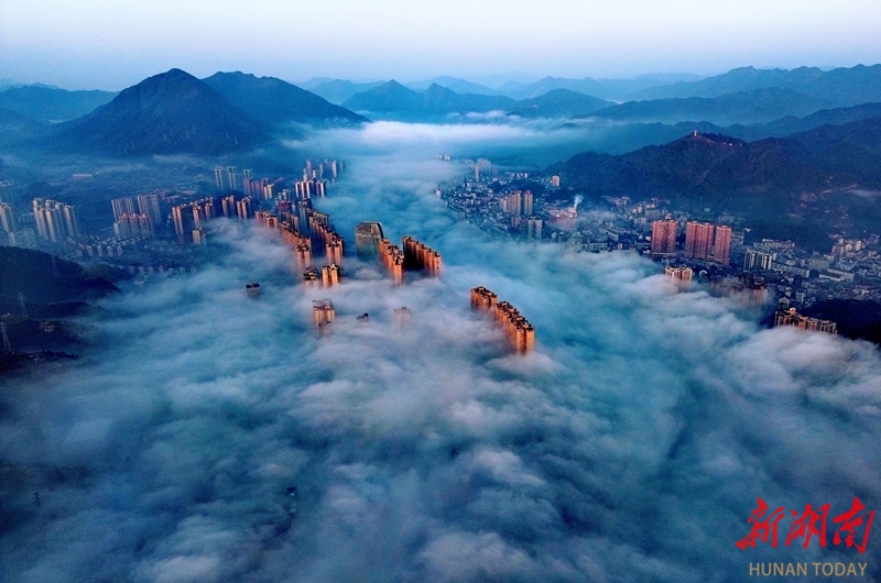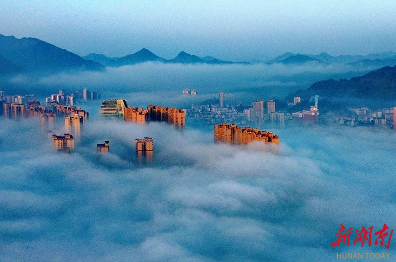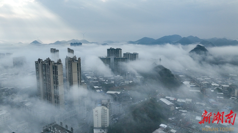2月14日,江永县城出现平流雾景观,城中楼宇在翻涌的云涛间若隐若现,宛如仙境。潘百旺 摄(湖南图片库)
