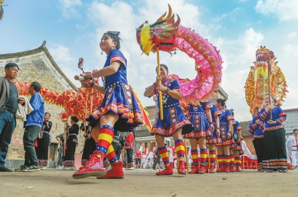 2月14日,江华瑶族自治县大路铺镇神岗古村,村民在舞龙。当天,该村举行马年“村晚”,村民开展形式多样的民俗活动喜迎新春,吸引众多游客参与体验。