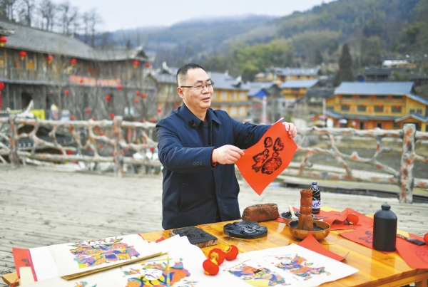 2月5日,崇木凼村非遗代表性传承人钟建桐在展示滩头年画。