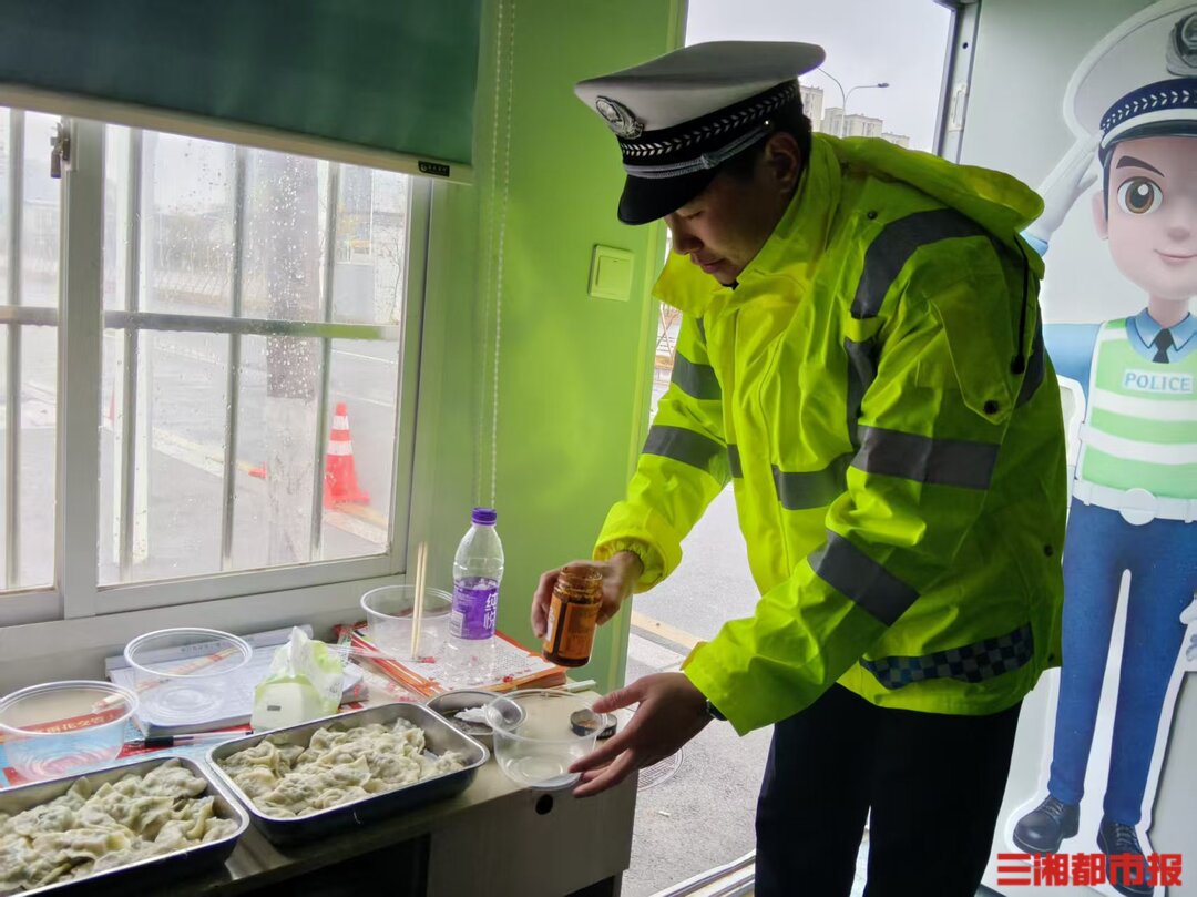 执勤的几位交警趁热吃起了饺子,“真的特别香,谢谢他们惦记着我们。”有交警这样说。