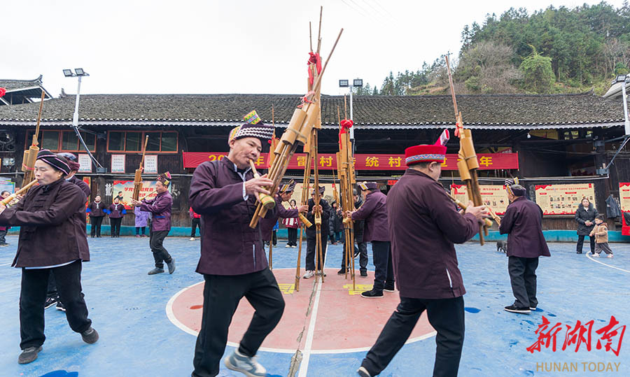 2月17日,通道侗族自治县陇城镇洞雷村,村民在进行芦笙表演。春节期间,该村举办传统春节庆祝活动。村民们在古村落里表演芦笙踩堂、琵琶合唱、多嘎多耶等特色非遗节目,现场歌舞欢腾,洋溢着浓厚的节日氛围。 杨顺韶 摄(湖南图片库)