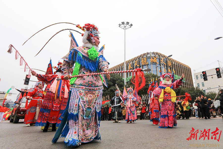2月18日,龙山县城,群众在进行传统戏曲展演。大年初二,当地群众表演了龙灯、狮子灯、传统戏曲、木偶戏和土家族摆手舞等丰富多彩的节目,欢庆新春佳节。 曾祥辉 摄(湖南图片库)