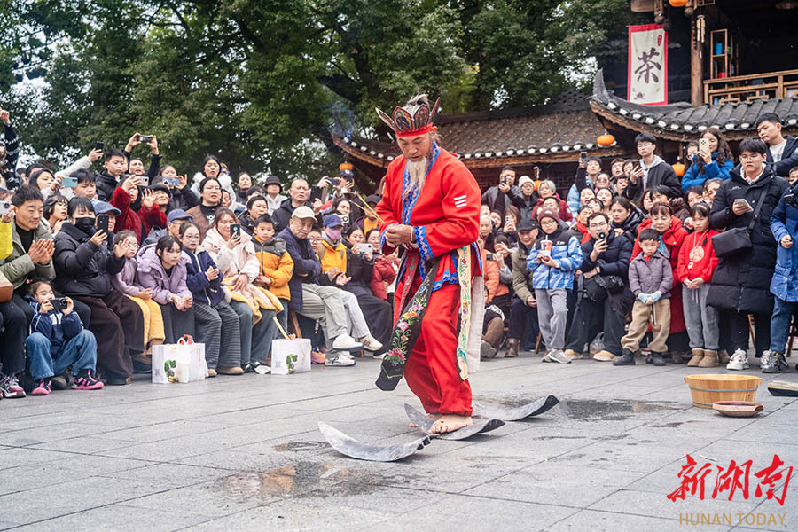 2月18日,永顺县芙蓉镇景区,游客在观看土家族梯玛表演的巫傩绝技。大年初二,该景区推出多项民俗体验活动,让游客在欢乐祥和的氛围中欢度新春。 彭璟 摄(湖南图片库)