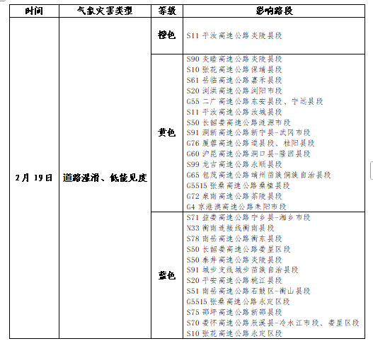 关注19日湘中以南、21日湘南降雨造成的道路湿滑、低能见度及20日湘中、湘东部分路段大雾天气造成低能见度对交通运行安全的影响。