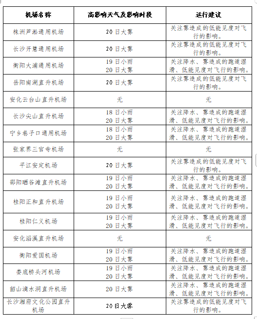 关注19日湘中以南降雨天气可能引起跑道湿滑、低能见度及20日湘中、湘东大雾对飞行的影响。