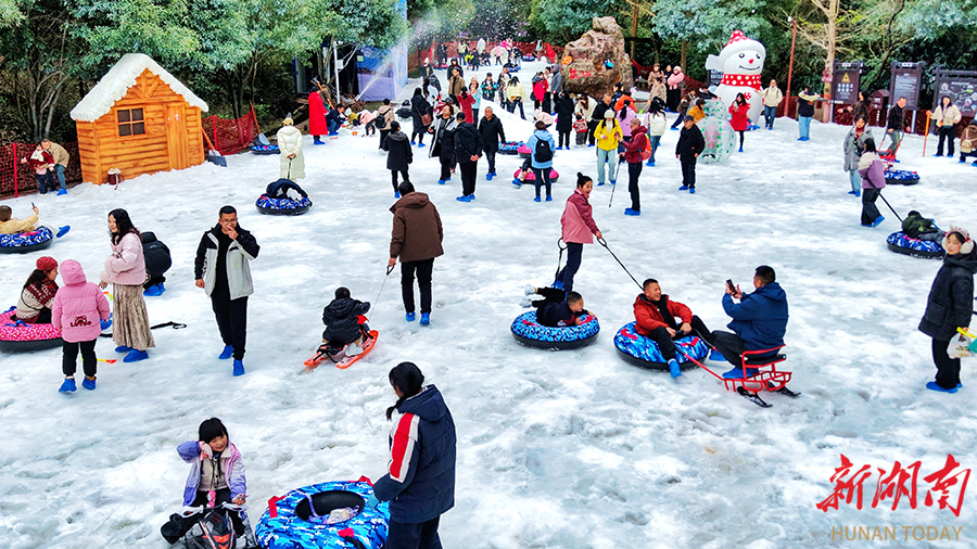 2月19日,新宁县崀山辣椒峰景区新春浪漫雪域吸引众多游客。丹霞地貌与人造雪景交相辉映,游客们在此堆雪人、滑雪圈、打雪仗,在欢声笑语中欢度春节。 鄢跃斌 颜克明 摄影报道(湖南图片库)