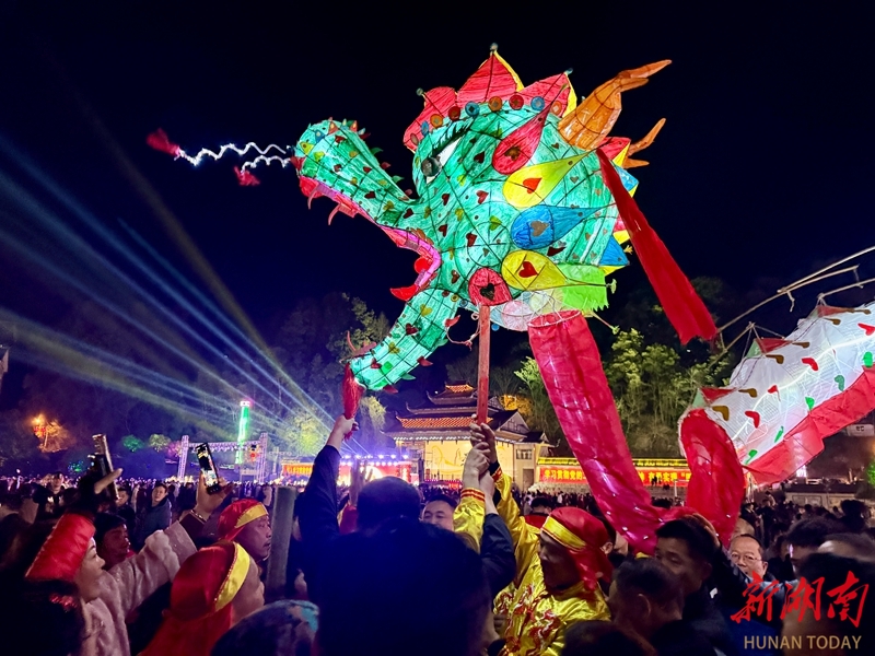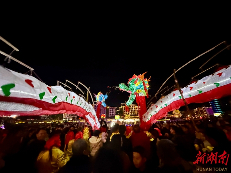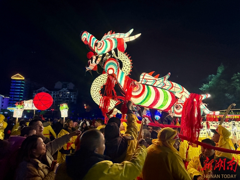 2月20日晚,通道侗族自治县民族文化广场锣鼓齐鸣,金龙翻腾,为现场观众呈现了一场充满侗族文化特色的新春民俗盛宴。陈俊宇 摄(湖南图片库)