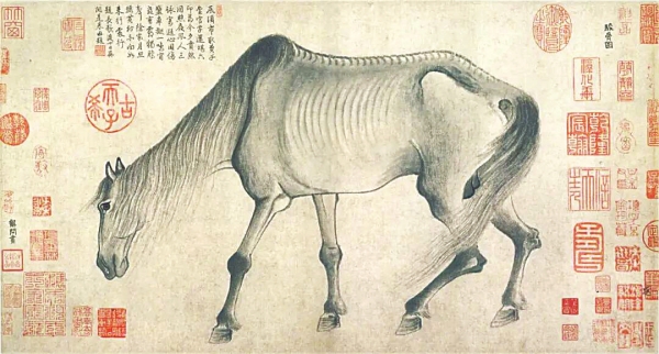 与其说龚开是在画马,不如说那匹马就是龚开自身的写照。虽故国已远,初心不改,信仰不灭,他如图中这匹瘦马独自行走于天涯,即便天地间只剩下自己一人,却始终坚守着心中的气节与忠贞。这匹马低着头,但站姿依旧稳健、孤傲,象征千里马的十五根肋骨尽显于外。龚开在这幅画的自跋上说:“惟千里马多至十有五肋。假令肉中画骨,渠能使十五肋现于外,现于外非瘦不可,因成此相,以表千里之异。”瘦的是身躯,强的是筋骨,坚的是信仰。龚开将所有的赤诚与坚守都凝于马的眼眸,这眼神,是对故国山河的深情守望,是对文人风骨的坚定传承,是守护精神家园的执着。纵使风雨如晦,风骨永不褪色,文脉终将绵延。