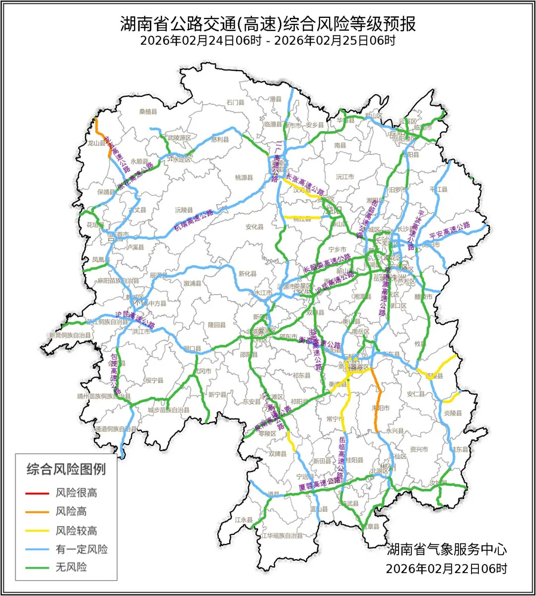 2月23至2月24日湖南省高速公路综合风险等级图影响路段