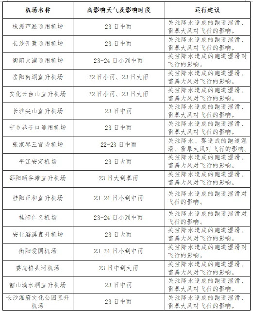 关注23日全省大部分地区降雨可能引起跑道湿滑、低能见度以及23日局地暴雨、雷暴大风等强对流天气对飞行安全的影响。