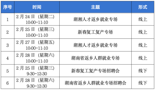 记者了解到,针对节后返岗复工关键期,“湘乐聘”直播带岗活动将同步精准发力,于2月24日至28日特别推出6场线上线下联动招聘,其中聚焦湖湘人才返乡就业、新春复工复产、返乡人群就业等主题开展4场线上直播,汇聚120余家企业超600个优质岗位。