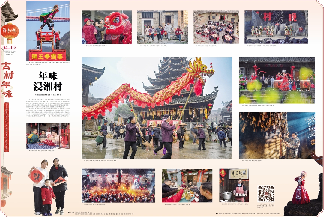 2026年新春,湖南日报全媒体记者踏遍三湘四水,深入湖南14个市州的14个传统村落,探寻千年文脉,触摸湖湘年味。在这盛世中国年,永州市上甘棠村张灯结彩,古韵盎然;邵阳市崇木凼村山歌婉转,涤荡心灵;怀化市芋头村,龙腾街巷,喜庆满溢;益阳市黄花溪村擂茶香醇,回味悠长;岳阳市张谷英村,腊味飘香,诱人味蕾……一景一味,皆是湖湘文化的鲜活传承。