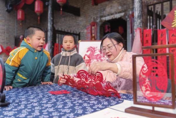 衡阳市双湾村,剪纸艺术家在为小朋友剪窗花。