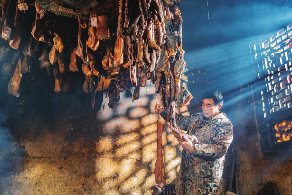 岳阳市张谷英村,村民在挑选腊肉。
