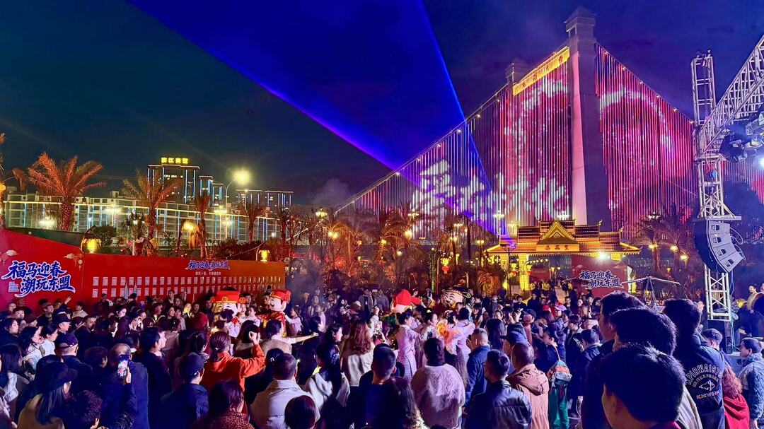 “圈友”东盟集作为全省首个东南亚风情园,充满了浓郁的“国际范儿” ,从大年初二至初七,这里不仅是异域风情的聚集地,更是年味拉满的狂欢现场,成为市民游客感受热烈年味的网红打卡地。荆坪古村大乐元音古琴展示馆里悠扬的雅乐不绝于耳,游客们亲手奏响古韵,感受宫廷音乐的魅力;青石古巷间 “财神爷”身着红袍、手持金元宝走街串巷为商户和游客送去新春红包,游客们纷纷表示这种沉浸式的年俗体验比单纯游玩更有年味。