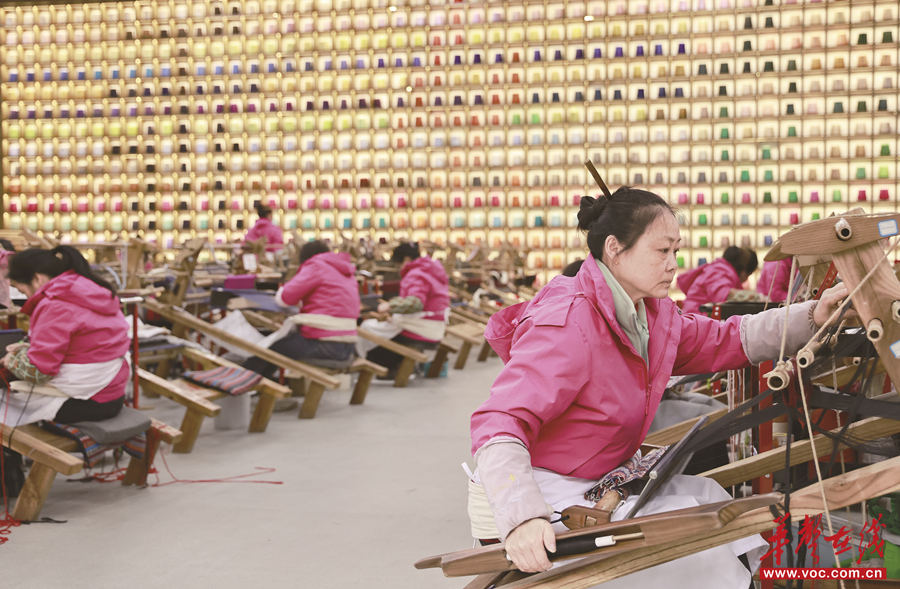 张家界市武陵源区乖幺妹土家族织锦生产研发基地,工人在制作土家族织锦产品。吴勇兵 摄(湖南图片库)