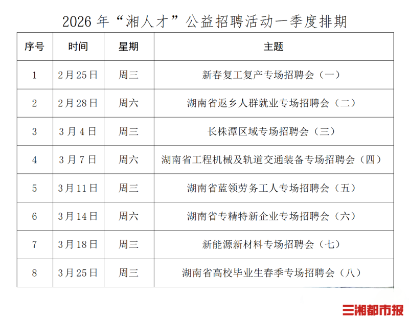 2月21日,记者从省人社厅获悉,湖南省2026年“湘人才”公益招聘活动第一季度安排了8场主题鲜明、精准聚焦的招聘会,为春节后复工复产注入人才“活水”,全力搭建用人单位与求职者高效对接的“绿色通道”。