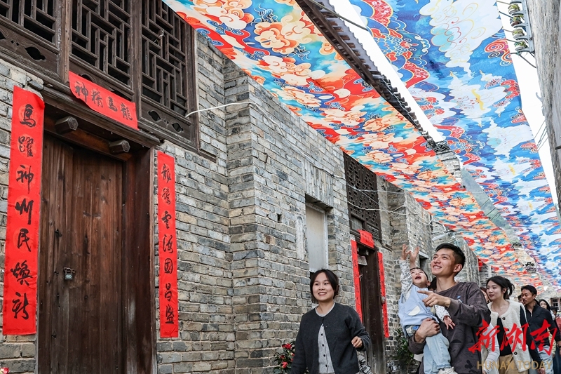 2月23日,临武县花塘乡石门古村,游客在游玩打卡。春节假期,该县龙归坪、上乔、乐岭等古村成为了不少游客的热门打卡地,人们逛古村、赏民俗,沉浸式感受古村年味。