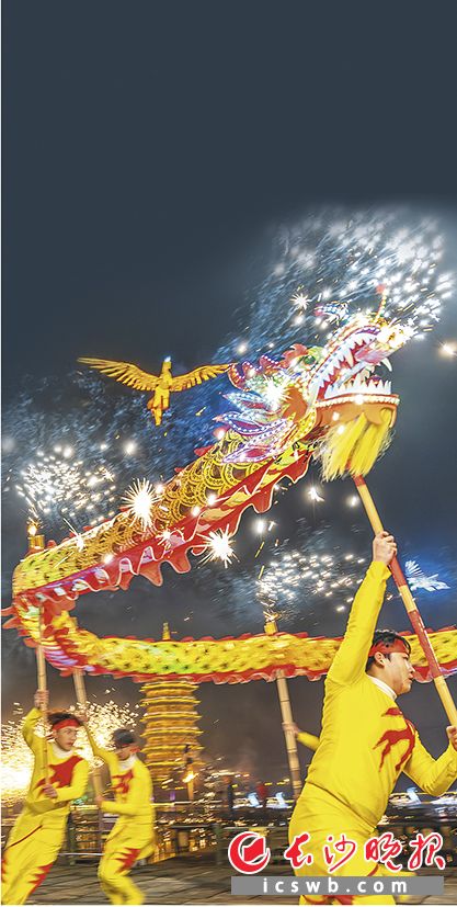 长沙铜官窑古镇的“天马+舞火龙”组合展开表演。长沙晚报全媒体记者 周数邑 通讯员 叶友朋 冷文娟 摄影报道